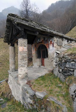 L'edificio è preceduto da un portico sorretto da due belle colonne tonde; sulla volta d'ingresso è raffigurata l'Annunciazione con figure di Santi ai lati; l'interno è dominato dalla presenza nella parete di fondo di una dolcissima Madonna in trono tra S. Pietro e S. Nicola (riprodotta in uno dei poster-arte realizzati dalla Commissione "Montagna Antica"); sulle pareti laterali sono conservate una Crocifissione ed altre figure di Santi.